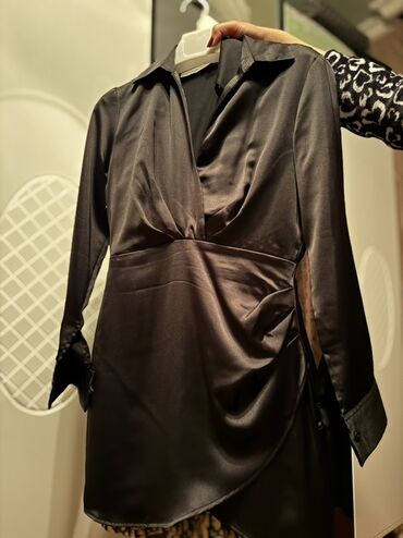 Qara atlas effektli mini don - Rəng: dərin qara - Material: parlaq, yumşaq, axıcı atlas tipli parça - Dizayn: köynək yaxalı, V kəsimli ön hissə; bel xəttində yığılmalar və yan tərəfdə drapirovka -...