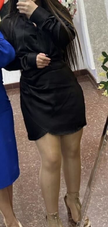 Qara rəngli zərif qadın paltarı - Model: bürünmə effekti olan mini don - Dizayn: V-yaxalı, ön hissədə kəsişən (wrap) kəsim; ətək hissəsi asimmetrik və büzgülü - Qol: uzun qol - Siluet: bel hissəsi...