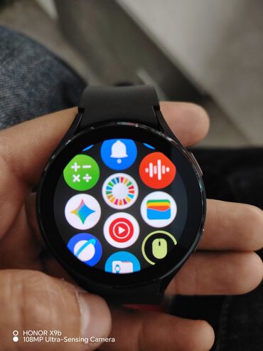Samsung galaxy watch 4 44m Ağıllı saat – qara rəng, dairəvi ekran və silikon kəmər.