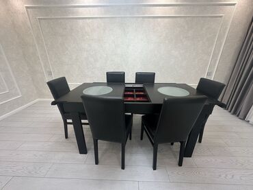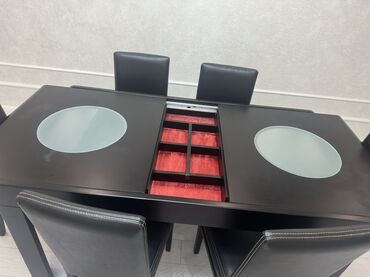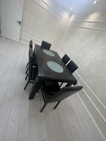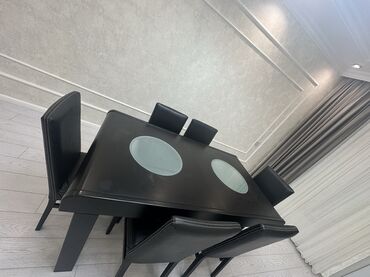 Yemək masası və stul dəsti - Rəng: qara - Komplekt: düzbucaqlı yemək masası + 6 ədəd stul. Qirigi yoxdu.Amma cizigi var stolda.Stullar kojadi bezi yerlerde ciziqlar var.Real aliciya endirim olacaq