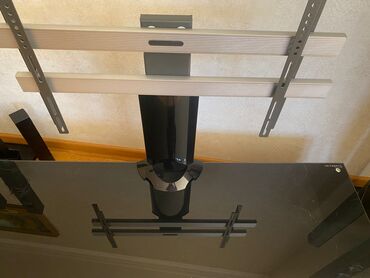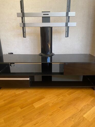 - Material: parlaq qara temperli şüşə üst və alt rəf, metal karkas - TV üçün mərkəzi şaquli metal dirək və üstündə universal VESA tipli TV bərkidici panel - Paneldə tənzimləmə üçün bir neçə bərkid...