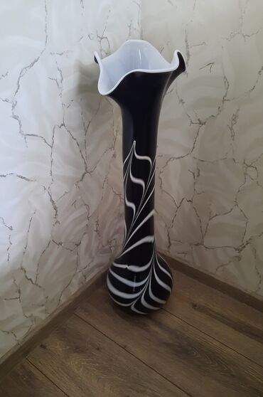 Dekorativ döşəmə vazası - MateriaI: Şüşə - Rəng: Qara üzərində ağ naxışlar, iç hissə açıq boz - Dizayn: Dalğalı, zərif formaya malik hündür siluet; aşağı hissədə geniş dayaq, gövdədə spiral/ağ xət...