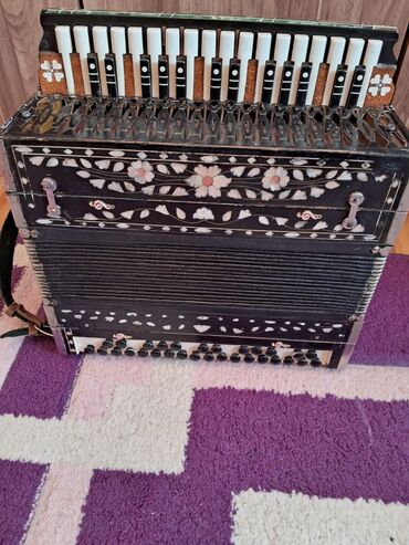 Məhsul: dekorativ naxışlı köhnə tip harmonika (akkordeon) Xüsusiyyətlər: - Üst klaviatura: 25 düyməli pianino tipli klavişlər (ağ-qara), bəzəkli panellə - Aşağı hissə: bas/səsləndirmə üçün qara da...