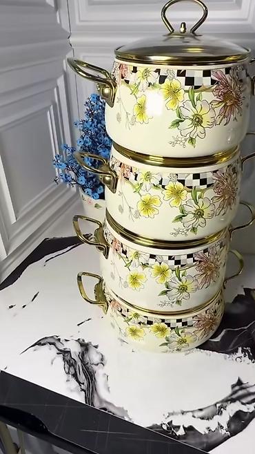 Çiçək naxışlı emal qab-qacaq komplekti - Material: emal örtüklü metal gövdə, daxili hamar, asan təmizlənən səth - Dizayn: krem-ağ fon üzərində çoxrəngli floral print, qızılı haşiyə və detallar; qa...