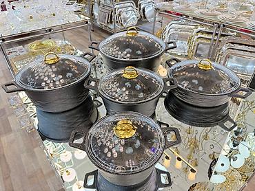 - Dəstdə ölçülər: müxtəlif diametr və hündürlüklərdə 5 qazan (həm dərin, həm geniş tipli).