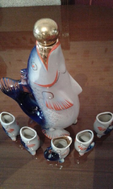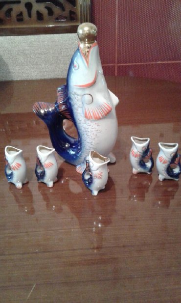 Ağ balıq formalı keramik qrafin və eyni üslubda hazırlanmış 6 ədəd kiçik qədəh 1100 manat.Qədəhlər tünd göy rəngdədir, balıq dizaynı ilə işlənmişdir. Qrafin və qədəhlər dekorativ məqsədlər üçün və ...