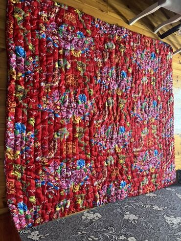 İkiüzlü yorğan - Ölçü: təxminən iki nəfərlik (şəkildə böyük ölçülü, döşəməni tam örtür) - Material: parlaq atlas tipli parça - Rəng və dizayn: - Bir üzü tək rəngli qırmızı, üzərində zərif naxışl...