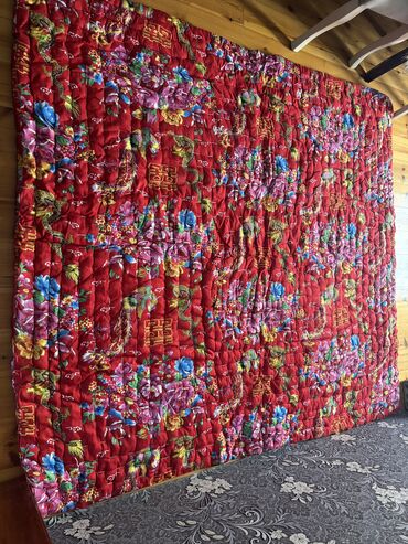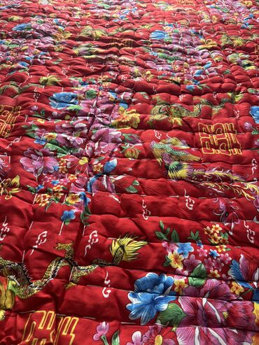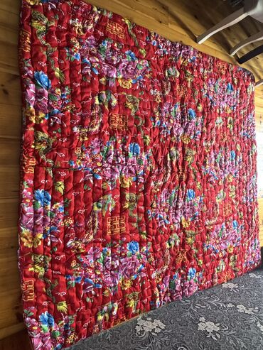 İkiüzlü yorğan - Ölçü: təxminən iki nəfərlik (şəkildə böyük ölçülü, döşəməni tam örtür) - Material: parlaq atlas tipli parça - Rəng və dizayn: - Bir üzü tək rəngli qırmızı, üzərində zərif naxışl...