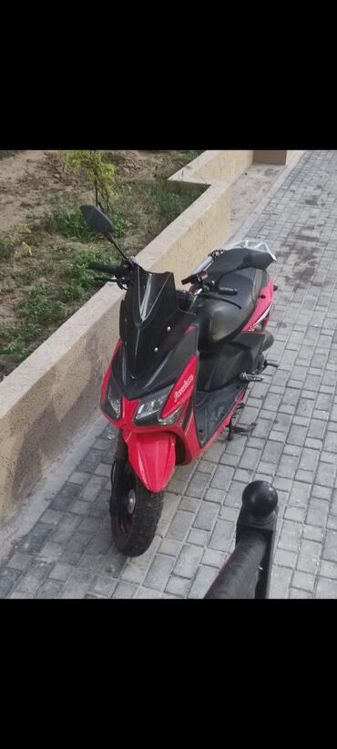Skuter/moped – şəhər içi rahat sürüş üçün. - Rəng: qara-qırmızı - Arxa oturacaq tutaçı (alyumin rəngli rels) və sərnişin üçün ayaq dayaqları - Arxa ikiqat stop işığı və dönmə siqnalları - Səsboğu...