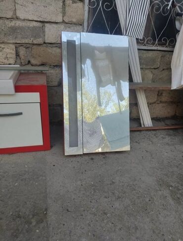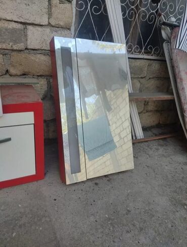 - Üst şkaf: güzgülü iki qapı, qırmızı yan çərçivə. Daxildə saxlama rəfləri üçün nəzərdə tutulub (güzgülü qapılar sayəsində həm vizual genişlik, həm də praktik istifadə).