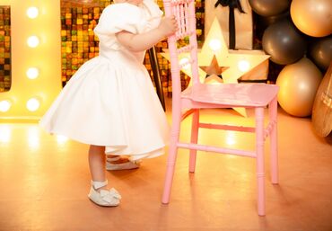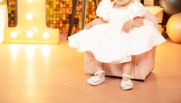 Ağ rəngdə qız uşağı üçün paltar - Üst hissə: qolsuz, dairəvi yaxalı, yüngül parıltılı toxuma - Bel xətti: nazik qızılı bəzək zolağı ilə vurğulanıb - Etek: beldən yığma, geniş və axıcı kəsim - Arxa...