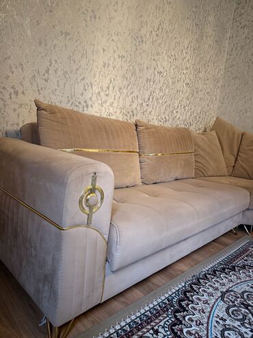 L‑formalı künc divanı – krem/bej rəngdə, qızılı dekor xətləri və metal ayaqlar ilə.