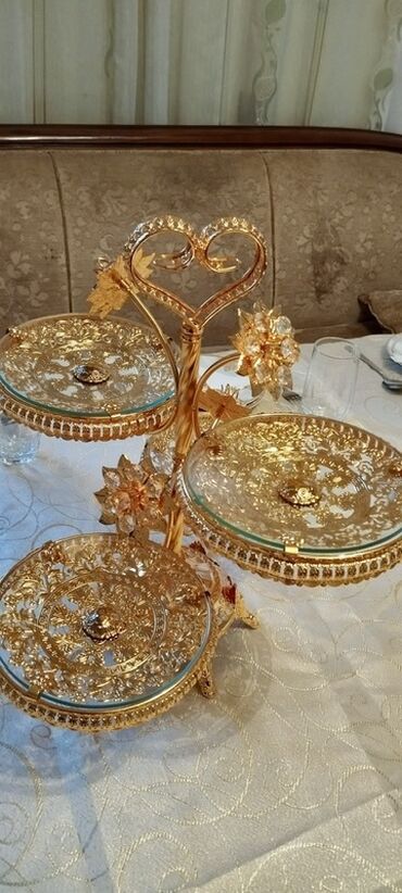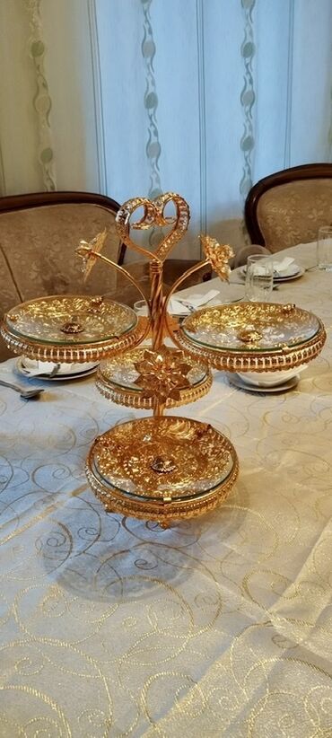 Üçmərtəbəli şirniyyat/biskvit stendi dəsti - Material: şüşə/keramika boşqablar, metal (qızılı rəng) mərkəzi dirək və tutacaq - Komplekt: 3 müxtəlif ölçülü boşqab + bərkidici metal hissələr və üst ...