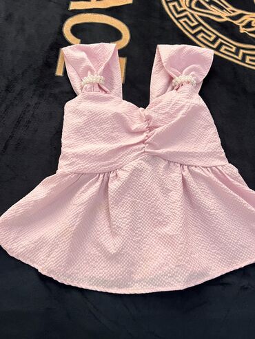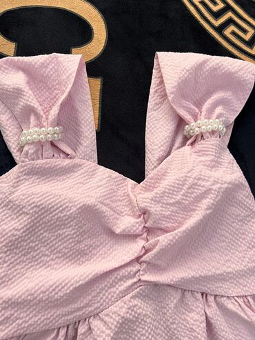 Uşaq üçün zərif ziyafət/libas paltarı - Rəng: açıq çəhrayı - Parça: yüngül, lay-lay ətək hissəsi ilə - Dizayn: qabarıq şar tipli qısa qollar, iri dekorativ ön bant (qurdelə) və mərkəzdə daşlı/bəzə...