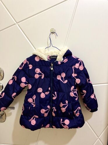 Uşaq paltosu – Obaïbi - Model: qız uşağı üçün şişmə (puf) gödəkçə - Ölçü: 23M / 86 sm (etiketdə göstərilib) - Rəng: yaşılımtıl-mavi üst, açıq çəhrayı astar - Naxış: xırda çəhrayı giləmeyvə/çəhrayı ...
