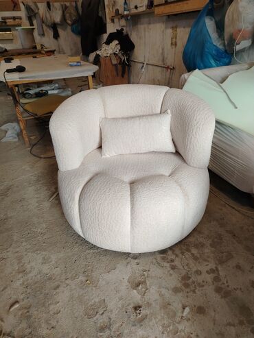 - Yumru kreslo: Eyni krem bouclé parça, çevrəvi qucaqlayan arxa hissə, iri segmentli oturacaq. Dəstlə harmoniyada olan bel yastığı daxildir.