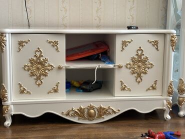 - TV tumbası: ortada açıq iki rəf (media avadanlığı və aksesuarlar üçün), hər iki yanda qapalı bölmə; ön hissə qızılı həkk olunmuş dekorla işlənib. Üst panel televizor pultu və aksesuarlar üçün genişdir.
