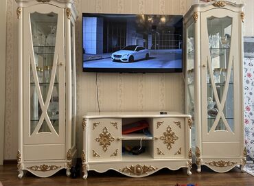 - Komplekt: 2 ədəd şüşəli vitrin şkafı + TV altlığı/kommód.