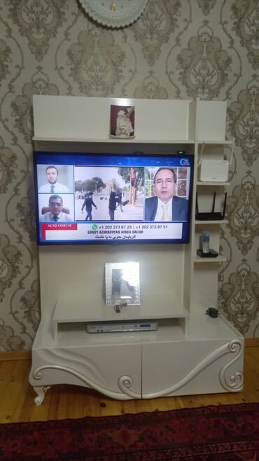 - TV stendi: üst rəf və açıq həcmli yan rəflər (modem/aksesuar üçün uyğundur), orta hissədə TV üçün panel, aşağıda bölməli dolab və rəf; dekorativ relyefli ön panellər və fiqurlu ayaqlar.