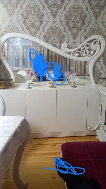 - Geniş güzgülü konsol: dalğavari formaya malik iri dekorativ çərçivə, 4 qapılı alt dolab hissəsi, saxlama üçün bölmələr.