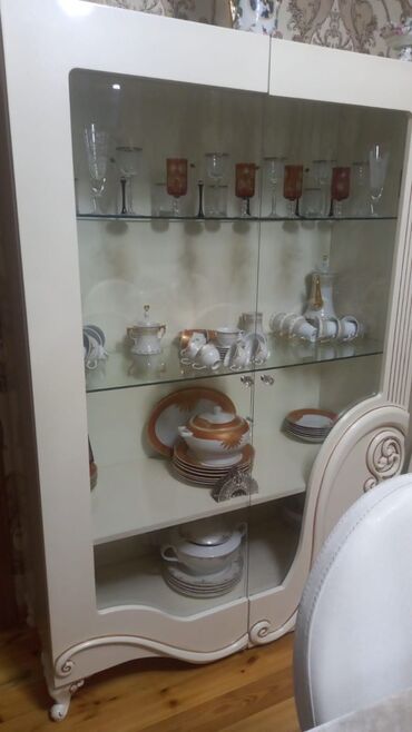 - Vitrin şkafı: şüşə qapılı, iki səviyyəli şüşə rəflər, işıqlanmanı dəstəkləyən konstruksiya, aşağıda əlavə saxlama bölməsi; ön tərəfdə dekorativ ornamentlər və fiqurlu ayaqlar.