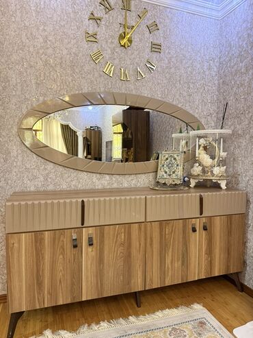 Klassik üslubda qonaq otağı mebel dəsti Tərkibi: - Böyük güzgülü konsol/komod – mərmər görünümlü üst səth, 4 qapılı geniş saxlama bölməsi, dekorativ relyeflər və qızılı bəzəklər. Üstündə böyük ölç...