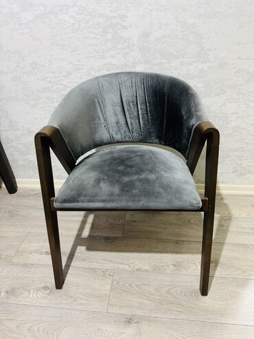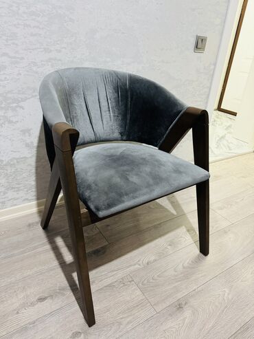 Zərif dizaynlı yemək otağı stulu - Rəng: açıq boz/gümüş tonlarında, məxmər teksturalı parça - Oturacaq və arxalıq: yumşaq süngərləmə, bel hissədə əyimli “kanat” formalı arxa dəstək; arxada dekorat...