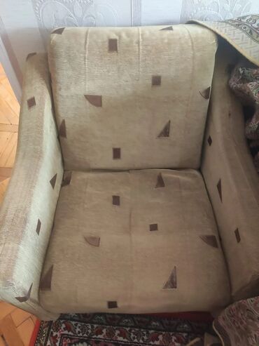 Mebel dəsti – qonaq və yataq otağı üçün - 4 ədəd yumşaq yemək stulu: karam rəngli parçadan, dikey tikişli bel hissəsi, komfortlu oturacaq, taxta ayaqlar. - Künc divan: açıq bej rəngdə, quilted (ro...