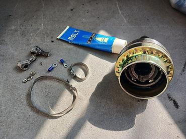 "Renault Clio" markalı minik avtomobilinin Qranatlar ehtiyat hissələri. Soldakı və ortadakı hissələr → tam yığılmış ötürücü şruslu vallardır (daxili + xarici qranatla). Sağdakı hissə → yarım ötürüc...