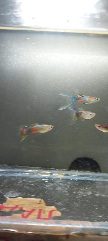 Canlı akvarium balığı – Quppi (Poecilia reticulata), seleksiya rəng formaları. Xüsusiyyətlər: - Parlaq çoxrəngli bədən və quyruq: göy, yaşıl, narıncı, qırmızı və qara naxışların kontrastı. - Uzuns...