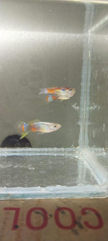 Məhsul: Quppi balıqları (Poecilia reticulata) – seleksiya rəng formaları Təsvir: - Yüksək rənglənmə: bədəndə iridisens parıltı, narıncı, qara və yaşıl ləkələr; uzun, şəffaf quyruqda qırmızı-mavi h...
