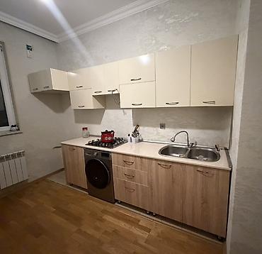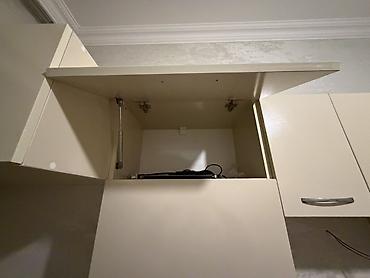 - Üst və alt moduldan ibarət mətbəx dəsti: yuxarı hissə krem rəngli parlaq fasadlı şkaflar, aşağı hissə ağac teksturalı fasadlarla.