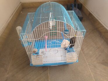 Dalğalı papağan və qəfəs dəsti - Növ: dalğalı (ağ-sarı başlı, yaşıl bədənli) kiçik papağan - Qəfəs: bənövşəyi altlıq və ağ metal barmaqlıqlar, şarjvari qövs damlı dizayn - Ölçü: hündür, geniş hərə...