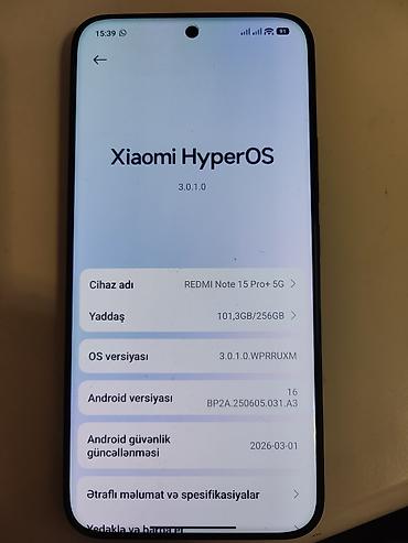 Model məlumatları qutuda göstərildiyi kimidir: REDMI Note 15 Pro+ 5G Black, 8GB RAM, 256GB ROM.