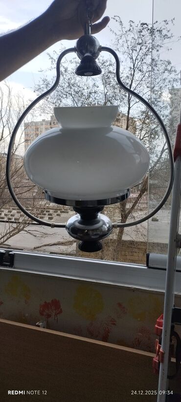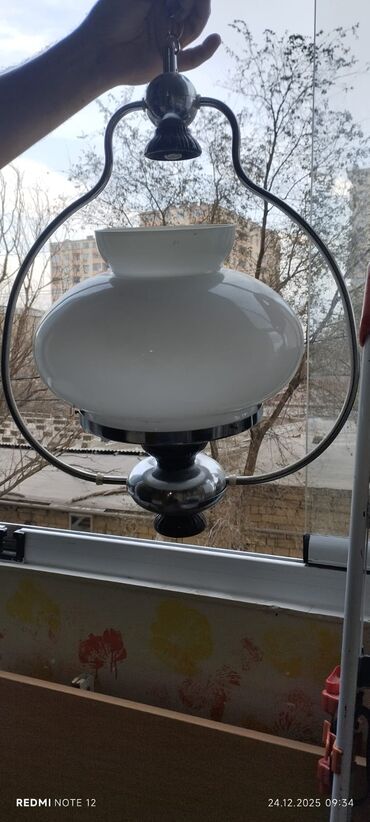 - Quruluş: dairəvi metal çərçivə, yuxarıdan asma bərkidici halqa, mərkəzdə iri şüşə abaşur