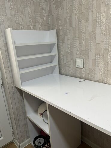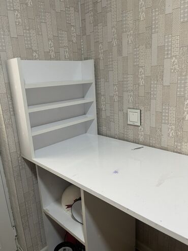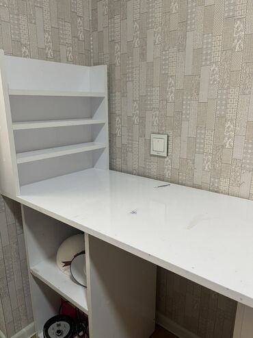 Ağ rəngdə, rəflərlə birləşdirilmiş masa. Bu funksional dizayn, iş sahənizi təşkil etmək və əşyalarınızı səliqəli şəkildə saxlamaq üçün əlverişlidir. Masa üstü sahəsi noutbuk və ya digər iş ləvazima...