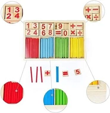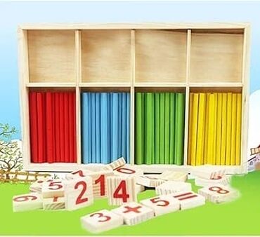 - Dəst tərkibi: rəngli say çubuqları (qırmızı, mavi, yaşıl, sarı), taxta fişlər üzərində 0–9 rəqəmləri və riyazi işarələr (+, −, ×, ÷, =)