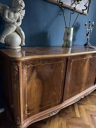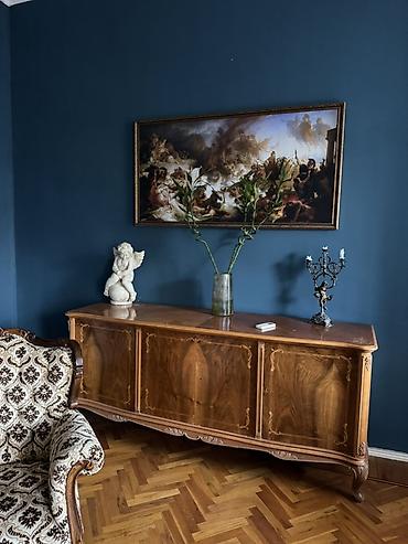 Açıq krem rəngdə, klassik dizaynlı geniş bufet/komod. Üst hissədə üfüqi güzgü paneli, aşağıda 4 bölmə: 3 qapılı şkaf və sağda 4 ədəd çekmece. Dairəvi halqa tipli tutacaqlar, konusvari ayaqlar. Otaq...