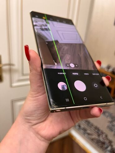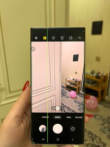 Kamera, telefon, video və digər funksiyaların interfeysi görüntülərdə göstərilib. Ağ, parlaq arxa paneldə “SAMSUNG” loqosu, kvadrat kamera adası.