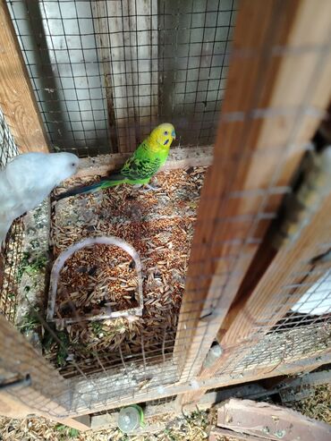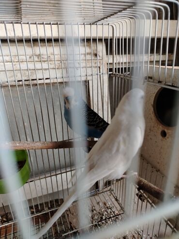 Dalğalı tutuquşular cütü - Növ: Budgerigar (dalğalı tutuquşu) - Rənglər: biri mavi-ağ zolaqlı, digəri tam ağ (albinoya yaxın) Quşlar yumurta verən quşlardır bir biriləri ilə çox yaxşı yola gedirl...