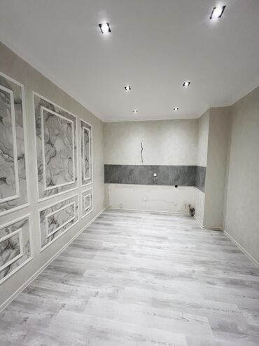 - Mətbəx zonası üçün ayrılmış hissə: kommunikasiya çıxışları, rozetkalar və su-gaz xəttləri hazır, işçi səth üçün dekorativ boz panel.