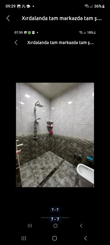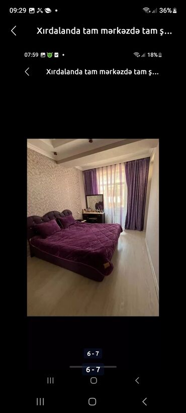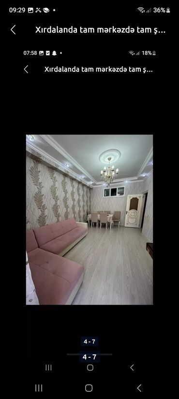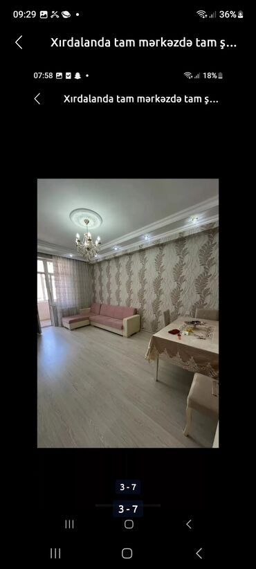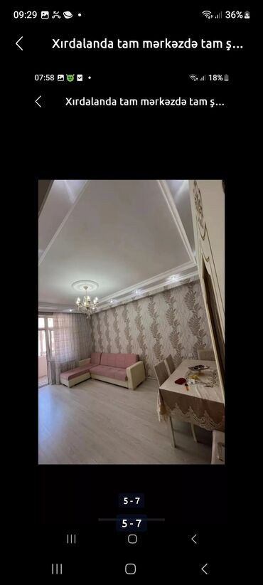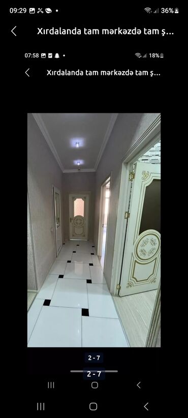 Xırdalanda yerləşən bu mənzil, zövqlü dizaynı və funksionallığı ilə seçilir. Dəhlizdəki ağ və qara plitələr, interyerə müasir bir hava qatır. Qonaq otağı geniş və işıqlıdır, rahat divan və yemək masası ilə təchiz olunub. Divarlardakı naxışlı divar kağızları, otağa xüsusi bir cazibə verir.