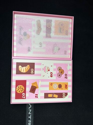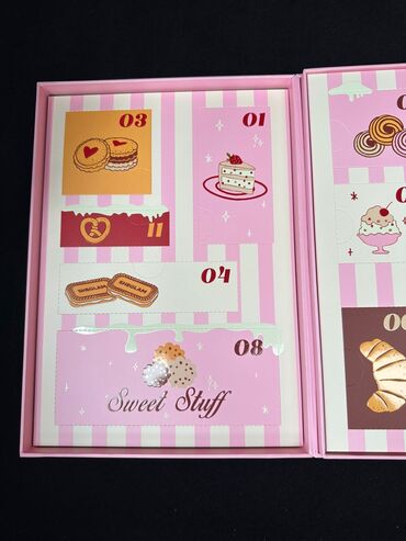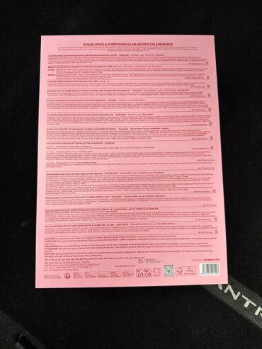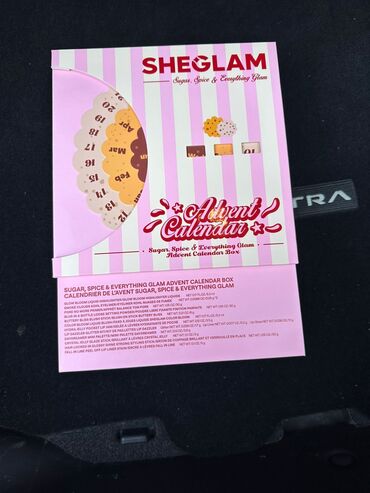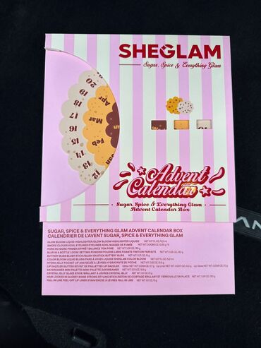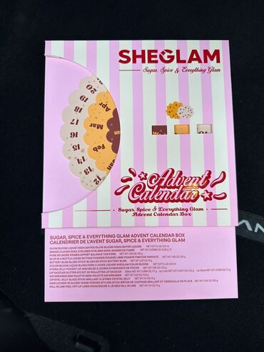 Qutu 12 pəncərəli dizayna malikdir, hər bölmədə yuxarıdakı məhsullardan biri yerləşir. Şirin temalı çəhrayı-qızılı dizayn, hədiyyəlik görünüş. Məhsul üzərində tərkib və istifadəyə dair çoxdilli məlumatlar, barkod və orijinallıq nişanlamaları mövcuddur. SHEGLAM brendinin rəsmi adlandırması və məhsul çəkiləri qutuda qeyd edilib. Bu Advent təqvimi ilə makiyajın müxtəlif mərhələləri – baza, üz parıltısı, yanaq, göz, dodaq və hətta saç parıltısı – üçün lazım olan məhsullar bir aradadır.