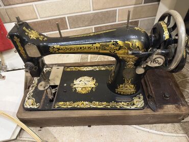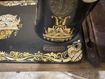 - Klassik, döküm gövdəli Singer tikiş maşını, üzərində orijinal qızılı ornamentlər və loqotiplər