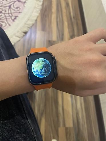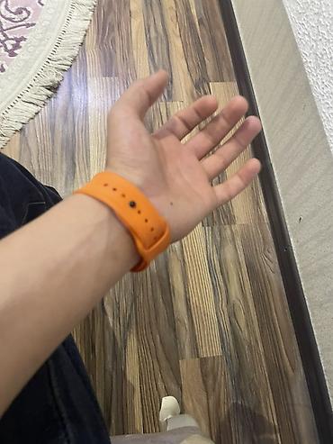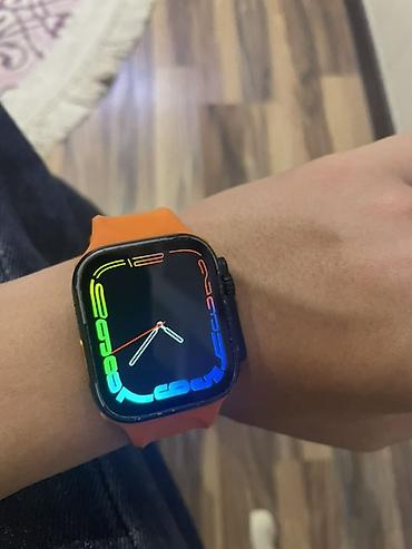 Ağıllı saat – kvadrat ekranlı, qara korpuslu, narıncı silikon qayışla.