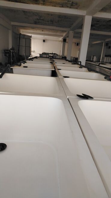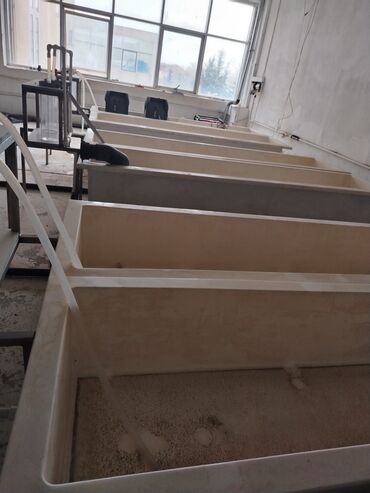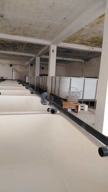- Böyük həcmli plastik havuzlar və uzun düzbucaqlı vannalar (bir neçə sıra), balıq və xərçəngkimilər üçün yetişdirmə/inkubasiya blokları