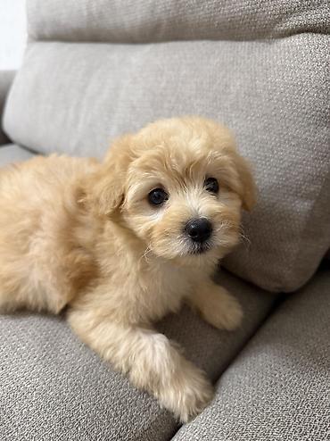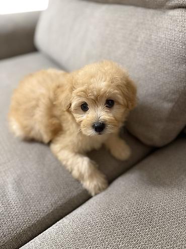 Maltipoo 4-5 aylıq bala - Cins: kiçik ölçülü, tüklü dizayn it (oyuncaq tipli) - Rəng: açıq krem/boz-qırıq ağ - Xüsusiyyətlər: yumşaq, qıvrım tüklər; qara burnu və gözləri; sallanan qulaqlar - Boyu...
