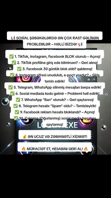 - Oğurlanmış və ya ələ keçirilmiş sosial media hesablarının geri qaytarılması