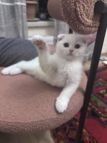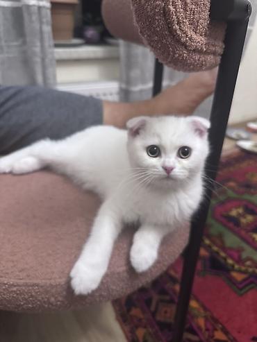 Ağ rəngli Scottish Fold balası - Cins: Scottish Fold (qatlanmış qulaqlar) - Rəng: Tam ağ, yumşaq və sıx tük örtüyü - Gözlər: Böyük, yuvarlaq - Burun və yastıqcıqlar: Açıq çəhrayı - Yaş qrupu: Yavr...
