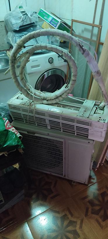 - Komplekt: daxili və xarici blok, uzaqdan idarəetmə pultu, montaj konsolları/metal bərkidicilər, mis boru və izolyasiya dəsti görünür.